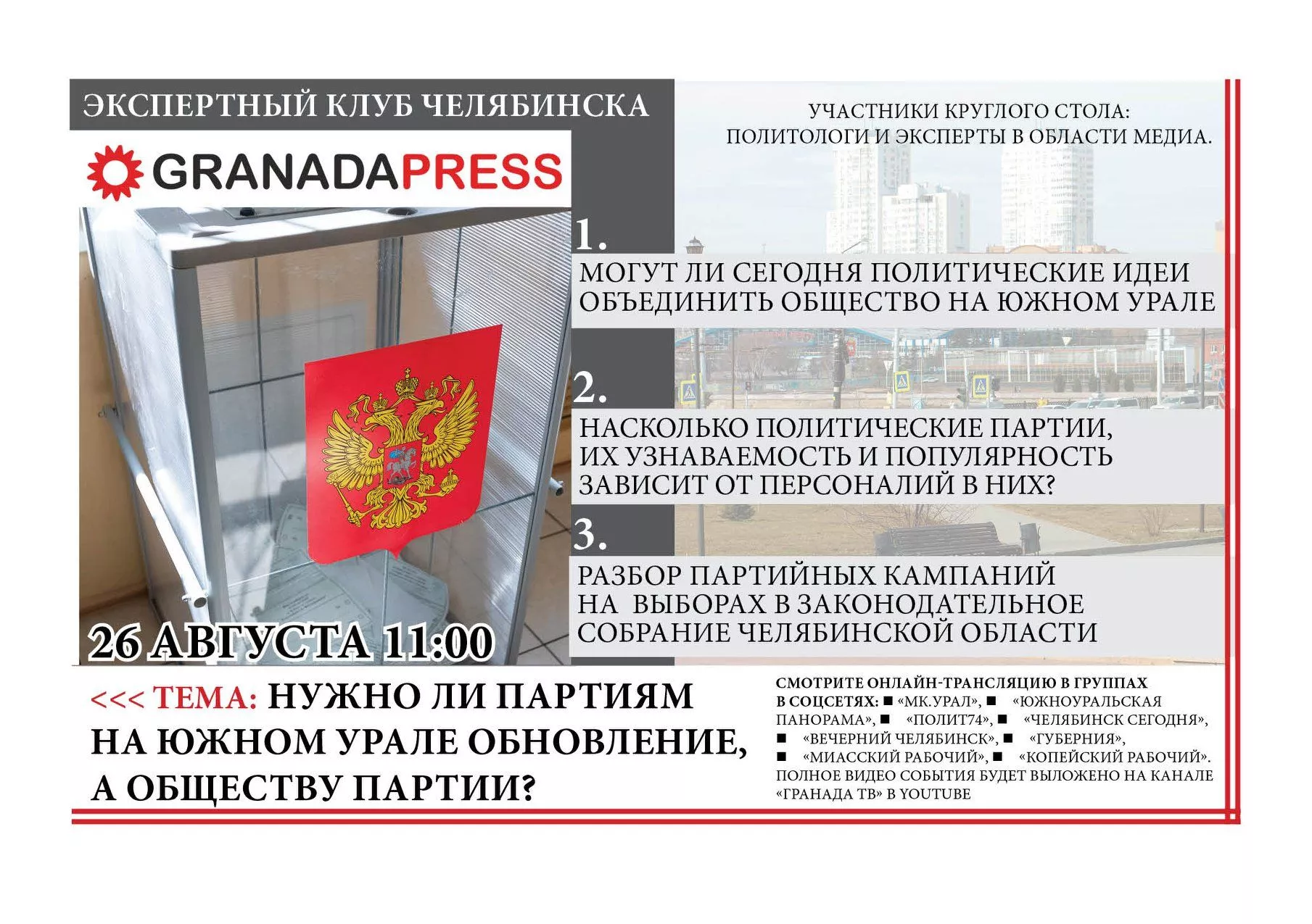 Сегодня, 26 августа, в 11.00, состоится пресс-конференция на тему: «Нужно ли партиям на Южном Урале обновление, а обществу партии?».