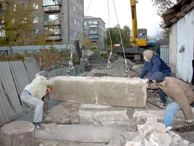 Итак, наслушавшись советов бывалых строителей и начитавшись полезных книг по строительству, созвав друзей-товарищей на помощь, мы начали рыть траншею под будущий фундамент глубиной на один метр. Следующим шагом стала засыпка траншеи гравием для подготовки надежного основания. В зависимости от почвы используются различные типы фундаментов. Так как почва у нас мягкая, мы использовали ленточный тип (подушка из бетона и железа) шириной не менее метра и блочный тип. Ленточный фундамент делается невысоким, 10-15 сантиметров. На гравийную подушку укладывается металлическая сетка, которая создает каркас, и заливается раствором бетона. Раствор мы изготавливали сами, в бытовой бетономешалке. Бывалые строители посоветовали нам приготовить его следующим образом: на 4 ведра дресвы засыпается 1 ведро цемента и заливается 1 ведро воды. Далее мы использовали бетонные блоки – «четверку» (длина 2,40 см, ширина 40 см и высота 60 см). Для того, чтобы уровень будущего фундамента был ровным, около бетонных блоков мы поставили опалубку, заложили на блоки металлическую конструкцию и залили бетоном. Да, кстати, при заливке бетона необходимо периодически добавлять щебень как наполнитель, для надежности.