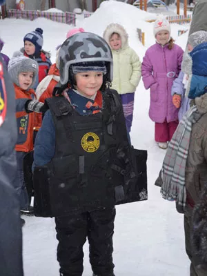 «Урок мужества» прошел на детской площадке для ребята из старшей и подготовительной групп. Командир роты майор полиции Александр Задорин и заместитель командира роты Олег Жуков рассказали о буднях работы правоохранителей и продемонстрировали спецсредства, применяемые при задержании. Психолог отдела Юлия Жарченко рассказала собравшимся об истории праздника 23 февраля. Кульминацией «Урока мужества» стала встреча с кинологом Лидией Попковой и ее четвероногим помощником немецкой овчаркой Мухтар, которые показали выполнение команд из общего курса дрессировки. От увиденного ребята были в восторге, а по окончании встречи их ждали сладкие подарки.