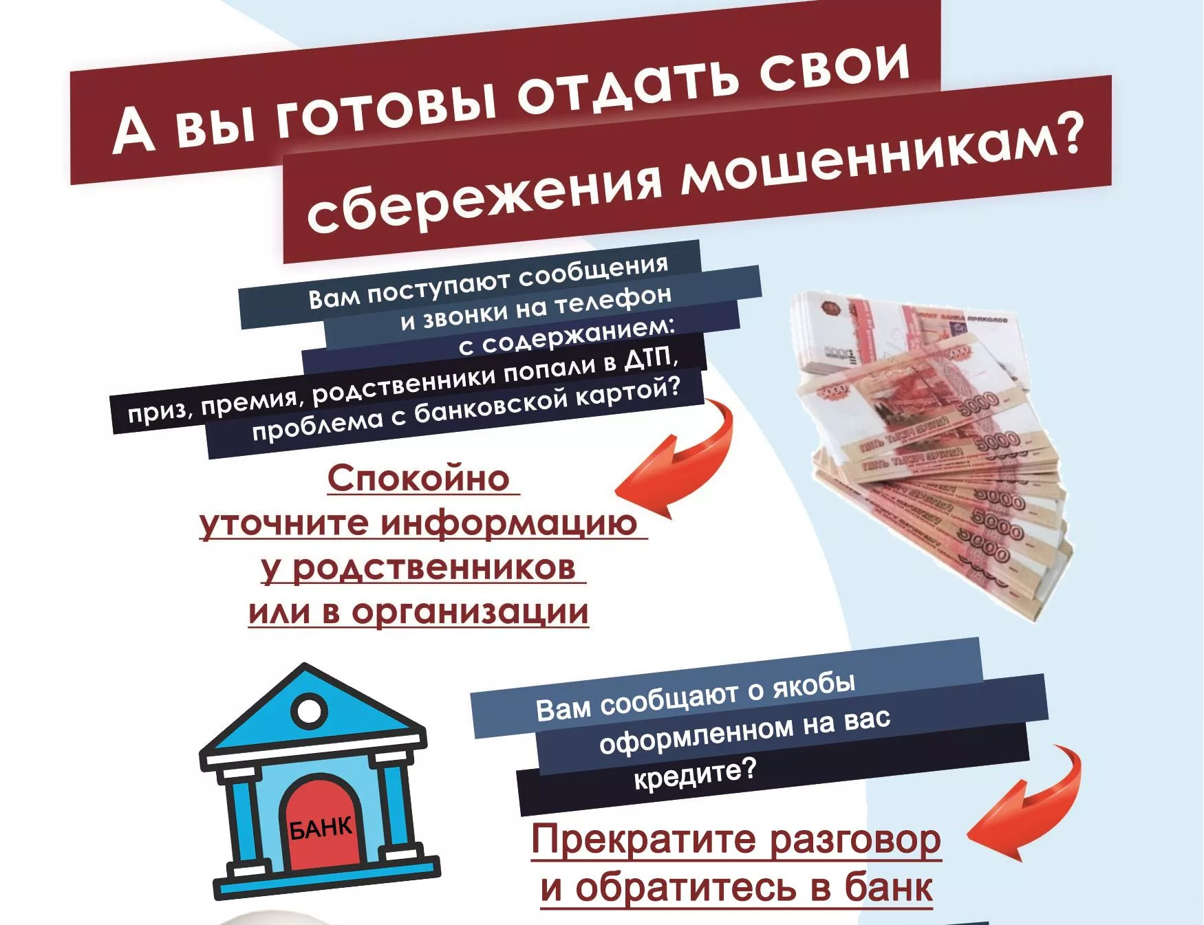 Если Вам поступил звонок от неизвестного с предложением совершить финансовую операцию, самое правильное решение, которое будет принято Вами – немедленно положить трубку. Будьте бдительны, не поддавайтесь на уловки мошенников и не переводите свои сбережения по указанию незнакомцев. Проверяйте всю информацию, полученную в ходе телефонного разговора. С целью предупреждения преступлений подобного характера в отношение ваших престарелых родственников побеседуйте с ними на эту тему и разъясните, что необходимо сделать в таких случаях.