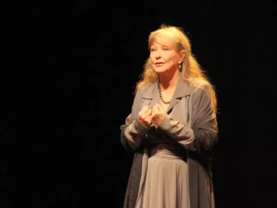 Несколько томительных минут ожидания. Гаснет свет. На сцену драмтеатра выходят три музыканта – с гитарами и контрабасом, начинают наигрывать попурри на песни Высоцкого. И вот желтый круг прожектора ведет за собой Марину Влади. Высокая, стройная, пышноволосая. И красивая. С ясными глазами. И просто не верится, что этой женщине - самой любимой женщине Высоцкого – 73 года. Она молода. Она эмоциональна. Она восхитительна.