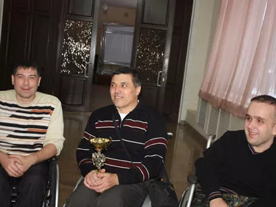 В фойе Дворца мне удалось поговорить с членами городского общества инвалидов Олегом Гайворонским, Ильгисом Максумовым и Дмитрием Манец. Будучи инвалидами-«колясочниками», эти молодые мужчины активно занимаются разными видами спорта, этоти легкая атлетика, и настольный теннис, и дартс. Но более всего увлекаются баскетболом.