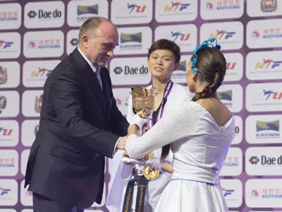 На полуфинальных и финальных боях чемпионата мира по тхэквондо среди женщин в весовой категории до 67 кг и мужчин до 68 кг глава региона присутствовал лично.