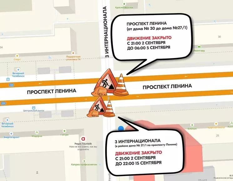 Дорога будет перекрыта с 21:00 2 сентября до 6:00 5 сентября на участке между домами №30 и №27/1 по проспекту Ленина.