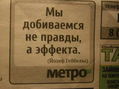 На этой неделе информационное пространство России заполнили сообщения об увольнении сотрудников редакции ВГТРК за цитирование Геббельса. А 29 января южноуральский блогер обнаружил фразу идеолога нацизма на страницах местной газеты «Метро74», название которой очень похоже на издание холдинга «Гранада пресс» - «Metro International».