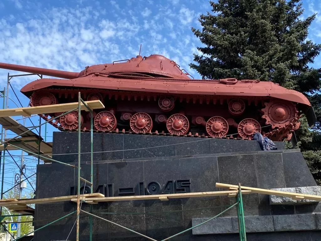 В первых числах мая известнейший танк ИС-3, который расположен на постаменте Комсомольской площади, приобрел интересный цвет. Как уточнили в пресс-службе горадминистрации, памятник обновляют к майским праздникам. Перед нанесением основного цвета танк был обработан грунтовкой, которая имеет столь необычный розовый оттенок.