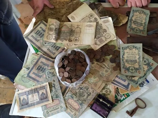 Настоящий клад от прадедушки нашел житель Троицка под полом своего дома. Он делал ремонт и наткнулся на тайник. В нем лежали множество банкнот и облигаций суммой 22 тысячи рублей, а также старинные предметы – бритву, шприц в коробочке, кухонный нож и кусочки меха.
