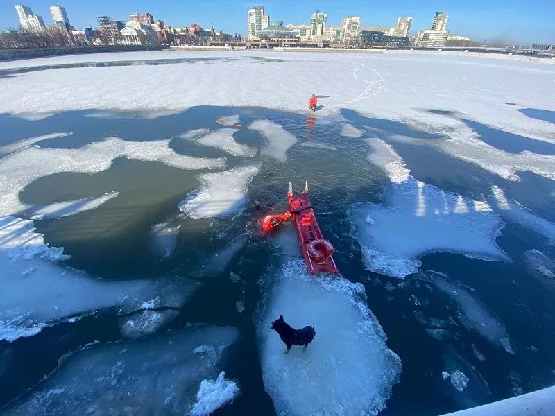 В центре Челябинска спасатели вытащили с льдины собаку. Для этого им пришлось нырнуть в ледяную воду и подплыть к животному со спасательной амуницией.