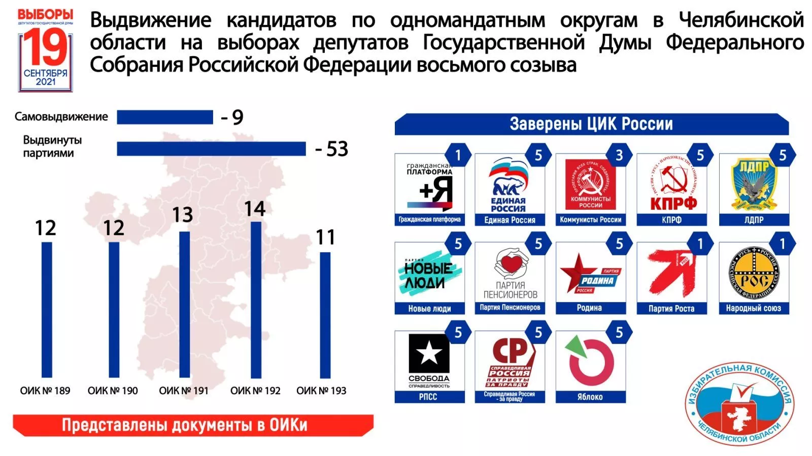 В предвыборной гонке в Челябинской области примут участие более 60 кандидатов. Из них 53 представители политических партий, 9 – самовыдвиженцы.