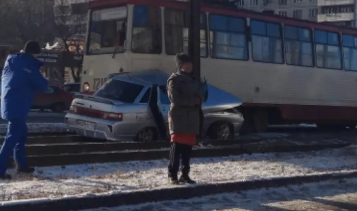 Автоавария произошла сегодня в Северо-Западе Челябинска. Очевидцы разместили в соцсетях фото, на котором видно, как серебристая «десятка» врезалась в столб, а с другой стороны она плотно притерта к трамваю.