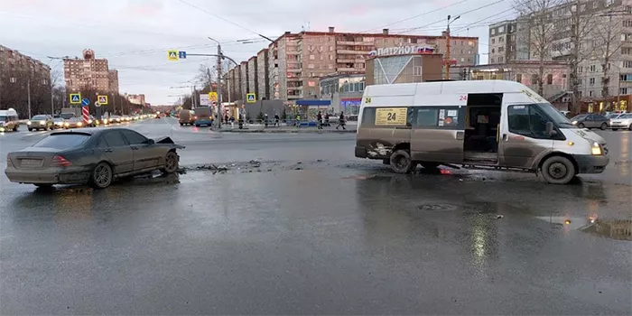 Как сообщили в ГИБДД, авария случилась в 15:47 на улице Чичерина. Маршрутка Ford Transit под управлением 33-летнего водителя столкнулась на светофоре со встречным автомобилем Mercedes Benz, за рулем которого находился 20-летний мужчина.