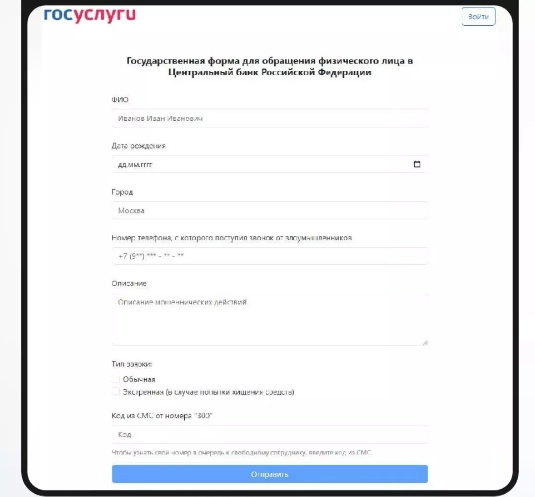 На домене GOSUSLUGIFORMS[.]RU вам предлагается заполнить заявление о мошенничестве в Центробанк и подтвердить его кодом, полученным с номера 300 (привязан к ЦБ).