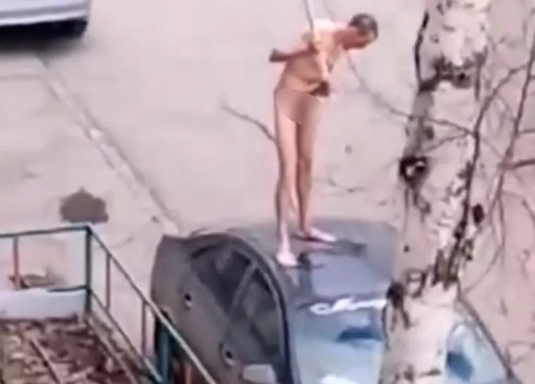На видео слышен закадровый голос женщины, которая представляется родственницей владелицы автомобиля. Она предлагает полицейским стрелять по ногам голого мужчины, однако стражи правопорядка опасаются даже подойти к человеку, который размахивает железной палкой.