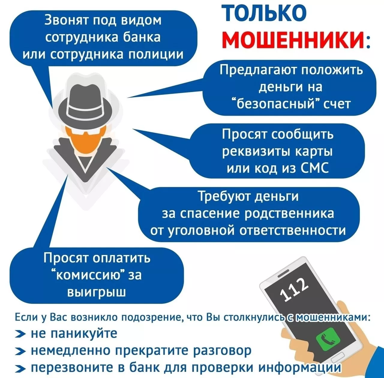 Например: банковские работники никогда не звонят клиентам с сообщениями о проблемах с банковским счетом, заблокированной банковской карте и не запрашивают конфиденциальные данные, относящиеся к платежным системам.