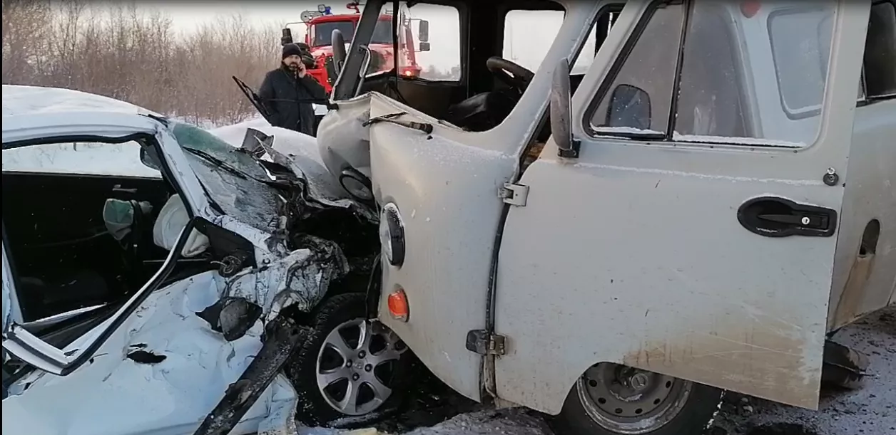 Произошло лобовое столкновение Хендэ Солярис и УАЗ 390944, а затем отечественное авто врезалось в Хундай Универс Спайс. Госпитализированы 5 человек.