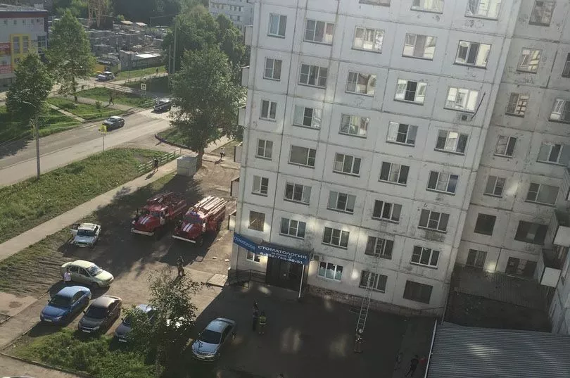 На снимке видно, что рядом со зданием стоят две пожарные машины.