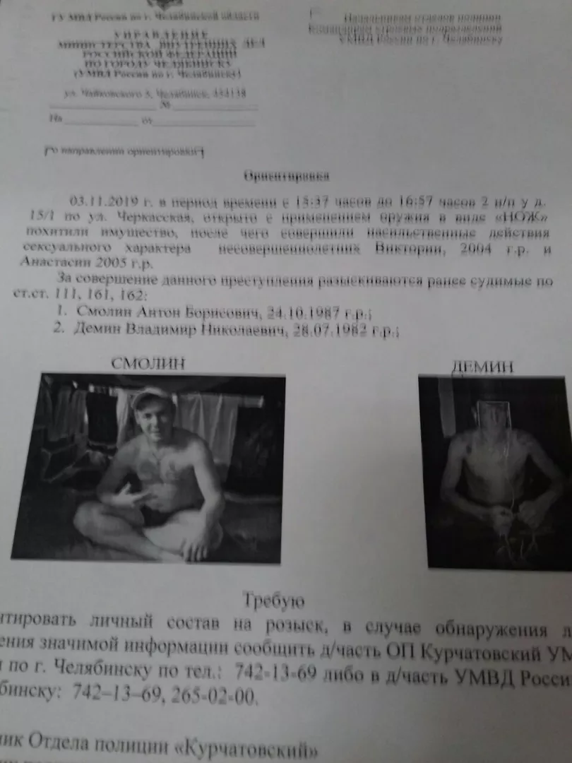 Напомним, что с утра в соцсетях была выложена ориентировка на двух челябинцев, которые 3 ноября совершили кражb и насильственные действия сексуального характера в отношении двух школьниц. Инцидент произошел в Металлургическом районе.