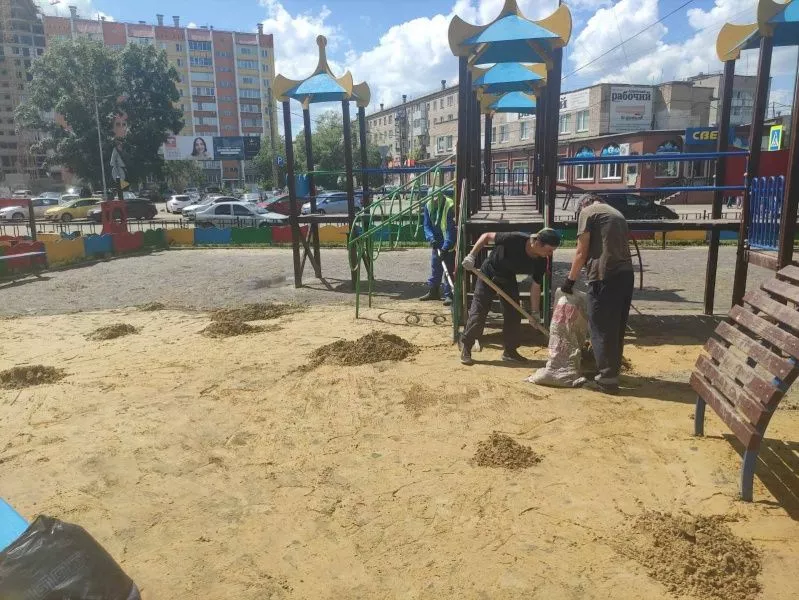 После того, как вода ушла, специалисты управления благоустройства очистили территорию детских площадок от мусора, сняли верхний слой песка, на котором осели тополиный пух и грязь. А затем засыпали площадки свежим песком.