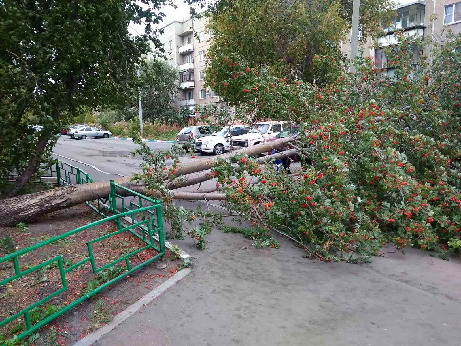 В центре Копейска дорогу перегородила упавшая рябина