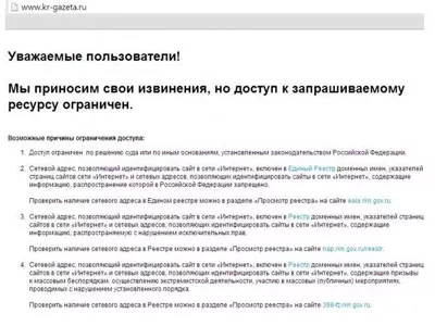 "Уважаемые пользователи! Мы приносим свои извинения, но доступ к запрашиваемому ресурсу ограничен". Именно так теперь выглядит страница сайта газеты "Копейский рабочий" для абонентов "Ростелеком". Первые сообщения о невозможности зайти на http://www.kr-gazeta.ru/ появились еще вечером первого апреля. Однако следующим утром стало ясно, что эти новости не были розыгрышем или шуткой. Среди возможных причин блокировки интернет-информатор называет нарушение законодательства РФ, распространение запрещенной информации. Интернет-провайдер сообщает, что адрес сайта "Копейского рабочего" может быть включен в Единый реестр доменных имен "забракованных" сайтов РФ. Однако, "Копейский рабочий" в списках реестра не значится. Другие интернет-провайдеры подобных санкций к сайту общественно-политического издания не применяли.