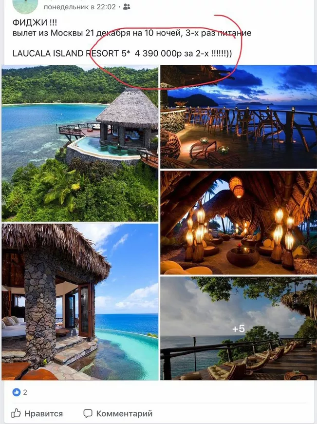 На фото видно, что 10-дневный отдых на Фиджи на двоих обойдется желающим воспользоваться предложением в… 4,4 млн рублей.
