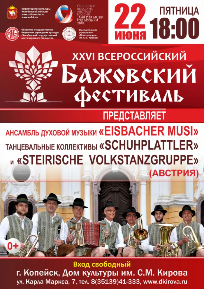 22 июня в ДК имени Кирова выступят гости из Австрии. На сцену копейского Дворца выйдут ансамбль духовой музыки «EISBACHER MUSI», а также танцевальные коллективы «SCHUHPLATTLER» и «VOLKSTANZGRUPPE».