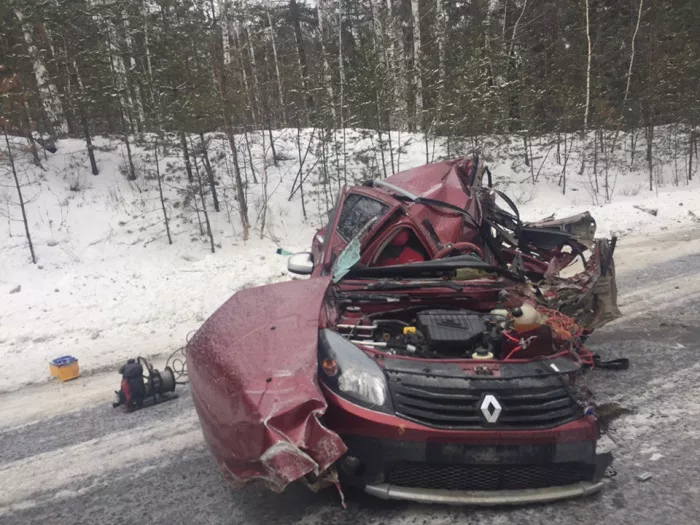 Легковушка после лобового столкновения выглядела, как мятый лист бумаги. Около часу дня на вызов по ДТП выехали спасатели Кыштымского спасотряда. Тело водителя Рено пришлось доставать гидроинструментом. 35-летний водитель грузовика не пострадал.