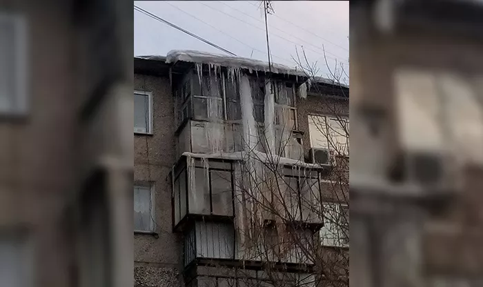 На балконах верхних этажей дома в Металлургическом районе наросла огромная сосулька. Она «обнимает» стеклянные и металлические конструкции сразу двух этажей.