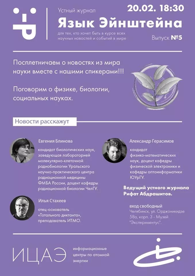 Сегодня, 20 февраля, в 18-30 откроется трансляция устного журнала «Язык Энштейна». В рамках мероприятия, которое проводится при информационной поддержке медиахолдинга «Гранада Пресс» эксперты обсудят последние новости науки.