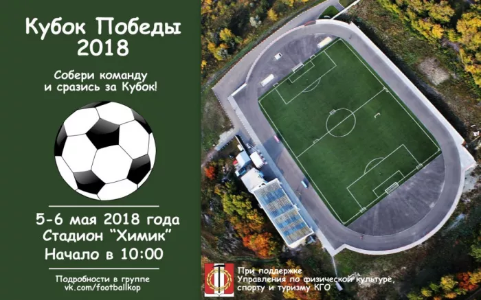 5-6 мая 2018 года на стадионе "Химик" состоится футбольный турнир "Кубок Победы - 2018", приуроченный к празднованию Дня Победы в Великой Отечественной войне.