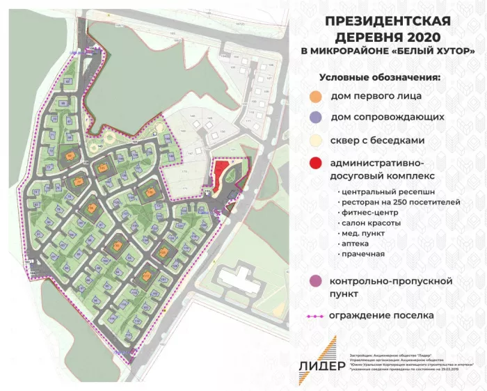 Компания-застройщик обнародовала план строительства президентской деревни, которую начали возводить на территории Сосновского района. В микрорайоне Белый хутор появится восемь роскошных коттеджей для президентов стран, которые прилетят в Челябинск на саммиты ШОС и БРИКС, которые запланированы на 2020 год.