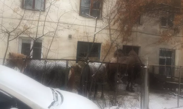 Сейчас за загородкой прямо у многоквартирного дома находятся 2 лошади, пони и верблюд. Бедные животные стоят на морозе без навеса. По словам местных жителей, их плохо кормят, за ними не убирают.