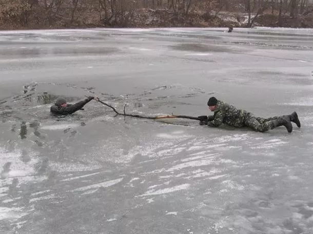 • подать пострадавшему подручное средство, вытащить его на лед и ползком двигаться от опасной зоны.