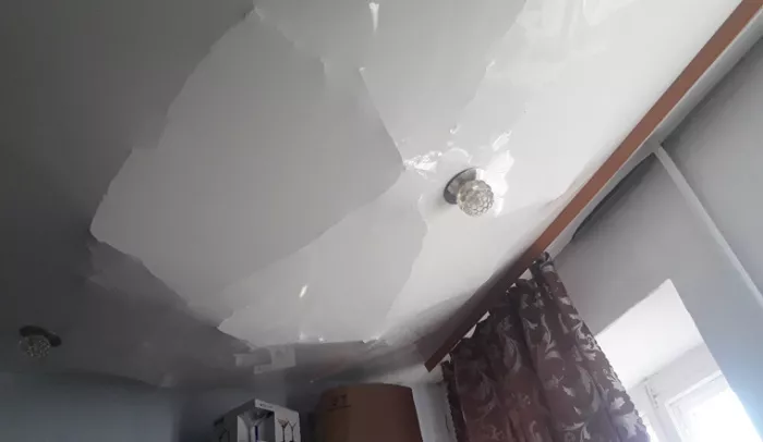 Проживающую в этой квартире женщину от смерти спас натяжной потолок. Он выдержал всю тяжесть, которая могла свалиться на диван женщины.