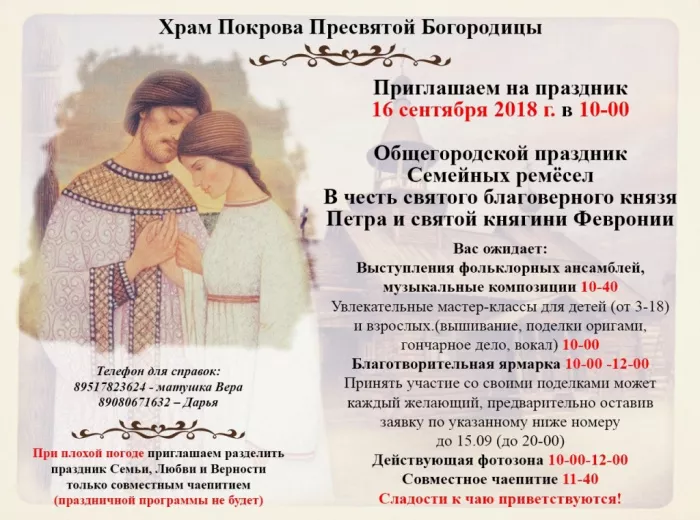 16 сентября в 10:00 Храм Покрова Пресвятой Богородицы организует семейный праздник в честь святых Петра и Февронии. Мероприятие пройдёт на открытом воздухе, на площадке около храма.