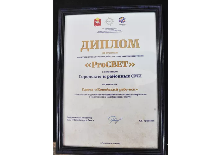 В этот раз диплом третьей степени копейская газета получила на конкурсе публикаций на тему электроэнергетики «Proсвет» в номинации «Городские и районные СМИ». Конкурс проводился ПАО «Челябэнергосбыт» при поддержке правительства Челябинской области в рамках федеральной акции «Надежный партнер».