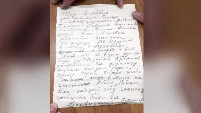Фотографией записки поделился портал 74.ru. Авторы записки указывают фамилии плотников своей бригады, а также точную дату написания. Они отмечают, что зарплата плотника 5-го разряда составляет 180-200 рублей в месяц. Описывая реалии жизни СССР того времени, рабочие пишут: «С продуктами вроде-бы и ничиво а вот мяса мы не видим годами. Наш руководитель Брежнев отправляет всё заграницу неграм Камбоджи, Индии, Ирану, Кореи. Вобщем жить не очень легко. В мире не спокойно. Войны, войны» (орфография и пунктуация авторов сохранены).