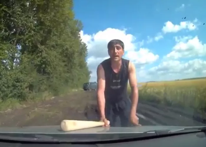 «Мы поехали с бабушкой за грибами ,решили повернуть с трассы на просёлочную дорогу рядом с железно дорогой и полем , но дорога оказалось болотом мы решили развернуться и тут нам перегородил дорогу УАЗ от туда вышли не адекватные люди которые начали требовать чтоб я вышел из машины ,двери в машине были заблокированны ,бабушка решила сними поговорить,один из них увидел что пассажирская дверь открылась и ворвался в салон, сидя на бабушки он начал меня выталкивать и вырывать руль ,душить и избивать меня . После чего бабушка закричала, и он решил выпрыгнуть из машины . Я вызвал полицию ,и мне сказали ехать в Миасс писать заявление . Бабушке 78 лет и тут такое ((». (Орфография и пунктуация автора сохранены).