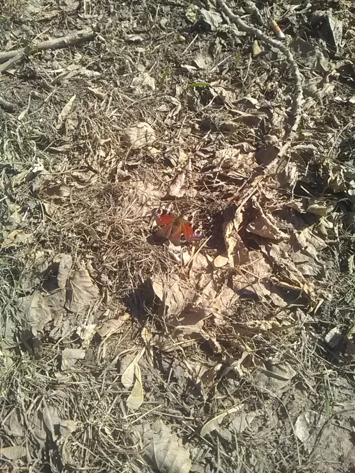Бабочка была сфотографирована на зимней листве, рядом уже пробиваются первые робкие цветы.