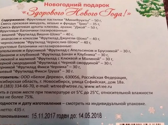 На Южном Урале диабетикам раздали просроченные подарки – дата производства специальных продуктов без сахара на упаковке обозначена 15.11.2017 года, а сам подарок годен до 14 мая прошлого года. Ребенок съел весь подарок, ему стало плохо, и лишь после этого он посмотрел на эти даты. Об этом он написал в соцсетях.