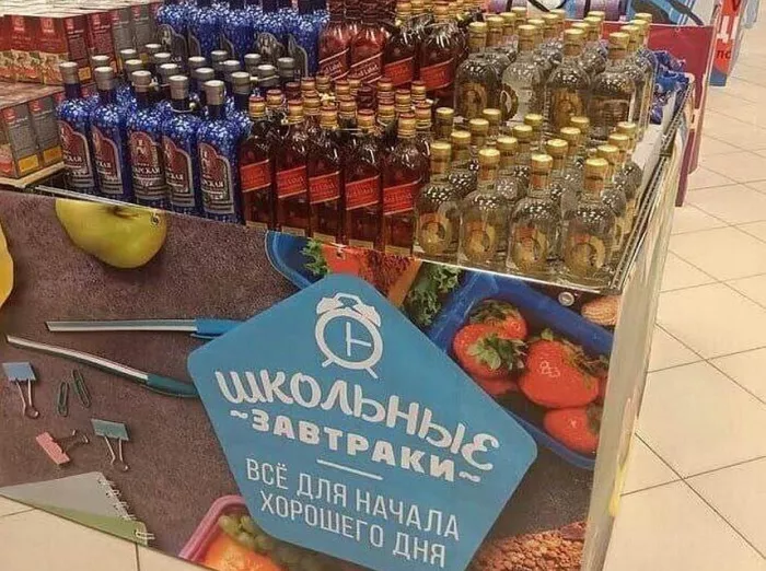Совсем недавно в соцсети попало фото из одного челябинского магазина, который принадлежит крупной торговой сети, - сообщает www.chel.kp.ru. На нем можно увидеть прилавок с алкогольной продукцией. Казалось бы, ничего необычного, но под бутылками написано: «Школьные завтраки. Все для начала хорошего дня».