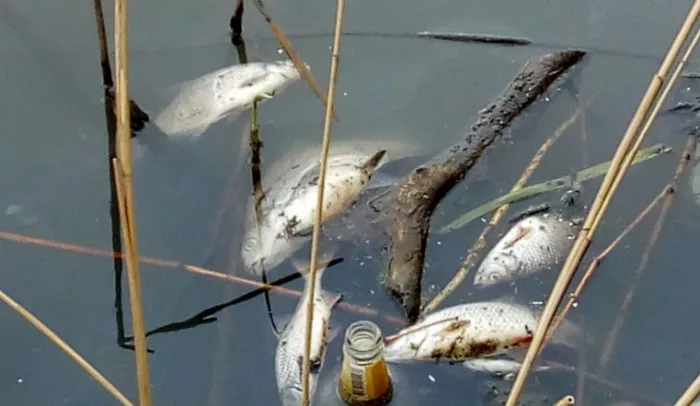 Снимки сделаны возле моста у поселка Першино. На фотографиях видно, что на поверхности воды плавает мертвая рыба.