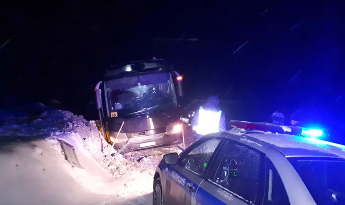 По дороге автобус попал в снегопад и водитель в таких дорожных условиях на спуске не справился с управлением. Когда он понял, что сейчас врежется во встречный автомобиль, то резко вывернул руль вправо. В результате транспорт вылетел на заснеженную обочину.