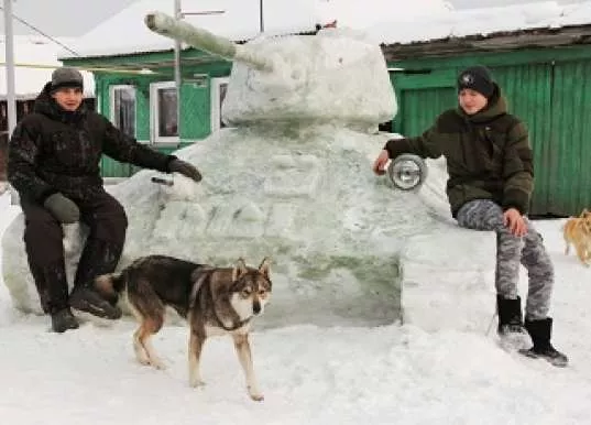 Саша Ломакин и Данил Чирков учатся в 9 классе местной школы города Куса. Минувшей зимой они захотели построить из снега танк. Точная копия Т-34 вышла всем на загляденье. В этом году они увеличили ее в два раза, и размер снежного монстра стал практически 1 в 1 к оригиналу.
