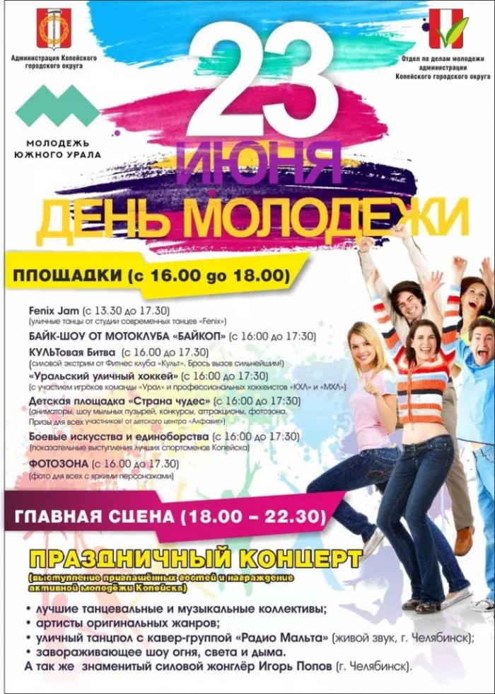 В эту субботу, 23 июня, копейскую молодежь ожидает яркий праздник. День молодежи пройдет на площади Трудовой Славы, где будет работать несколько творческих площадок.