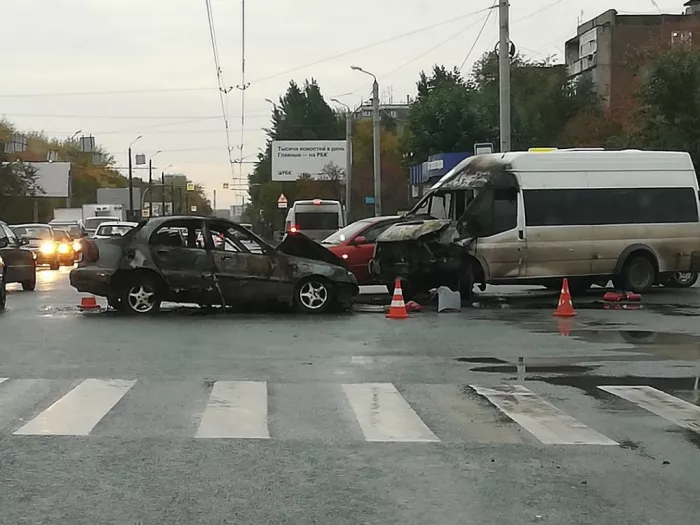 В Челябинске при столкновении загорелись легковушка и маршрутка