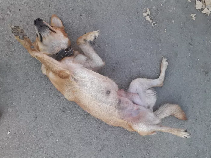 Прохожие увидели дворнягу в Тракторозаводском районе. Собака лежала на спине, чтобы люди поняли, что она – кормящая мать.