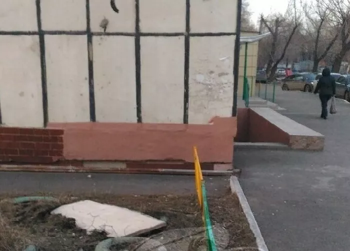 Большая плита, выступающая облицовкой здания №33-а по улице Гагарина, выпала с девятого этажа. Она чудом не зацепила людей, которые постоянно ходят по тротуару, и приземлилась на газон.