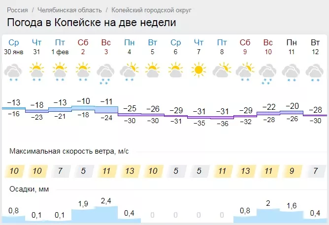 На этой неделе копейчан ждет теплая и снежная погода, однако уже к понедельнику синоптики сайта Гисметео обещают существенное похолодание. Дневные температуры составят 25-31 градус мороза, ночные достигнут 36 градусов ниже нуля. С учетом ветра ощущаться будет, как 40 градусов мороза.