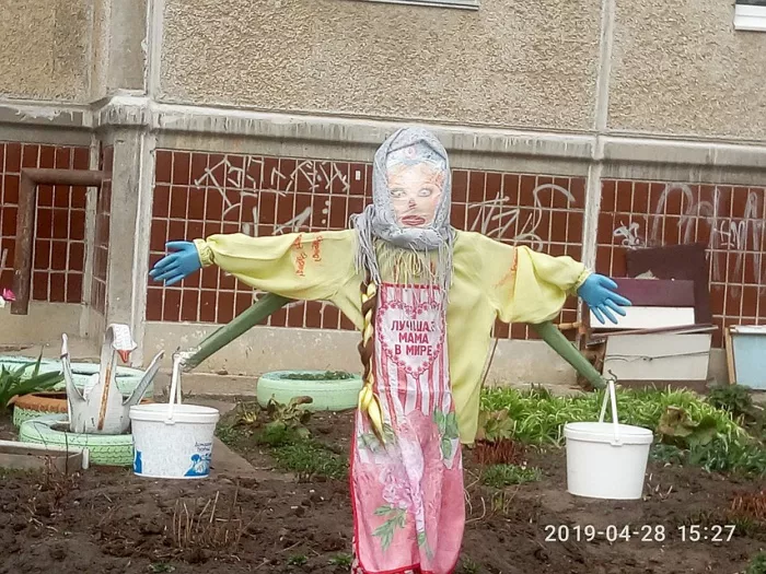 Пугало находится в окружении грядок с традиционными украшениями из старых шин и пластиковых бутылок во дворе типовой многоэтажки. По всей видимости, такая мама способна защитить не только от ворон, но и от воров.